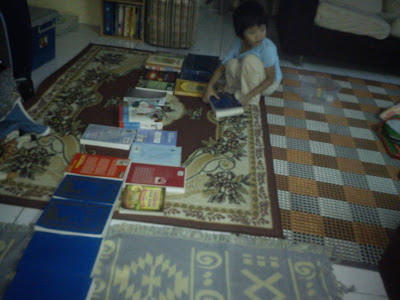 Tapi semalam, lepas makan basuh pinggan ambik masa lama sikit. Masa basuh pinggan tu, terdengar Umi jerit kat Amaninas suruh susun buku. Abi yang sedang fokus pada membilas sabun pada pinggan kaca yang agak berat jugak, takdelah ambik port. Selesai doin the dishes, Abi kedepan dan Masya Allah!